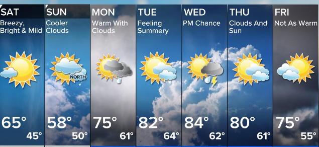 However, highs are expected to reach 77 on Monday and 83 on Tuesday before approaching 90 degrees on Wednesday. According to National Weather Service statistics, it might surpass the 1941 record high of 88 degrees for April 15.