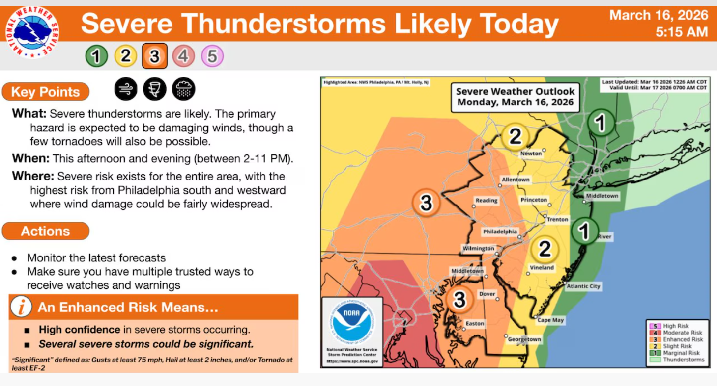 March 15, 2026Today’s Forecast: Timing for Thunderstorms, High Winds, and Tornado Risk in NJ