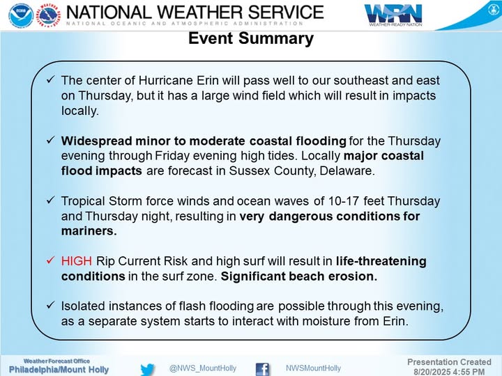 On Thursday, Erin's core is predicted to be spinning 350–400 miles southeast of Cape May at its closest pass. According to forecasters, the storm is close enough to deliver catastrophic rip currents, enormous waves, and wind gusts of 40 to 50 mph to beaches in Atlantic, Cape May, Monmouth, and Ocean counties.