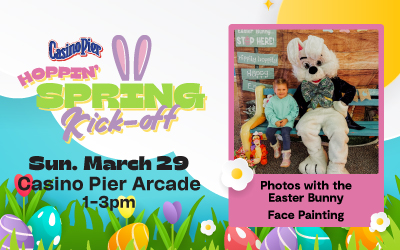 Spring is hopping into action at Casino Pier! Join us for our Hoppin’ Kick-Off celebration and kick off the season with smiles, fun, and unforgettable memories. Bring the family out to enjoy the boardwalk and don’t miss your chance to meet the Easter Bunny and snap some adorable photos together