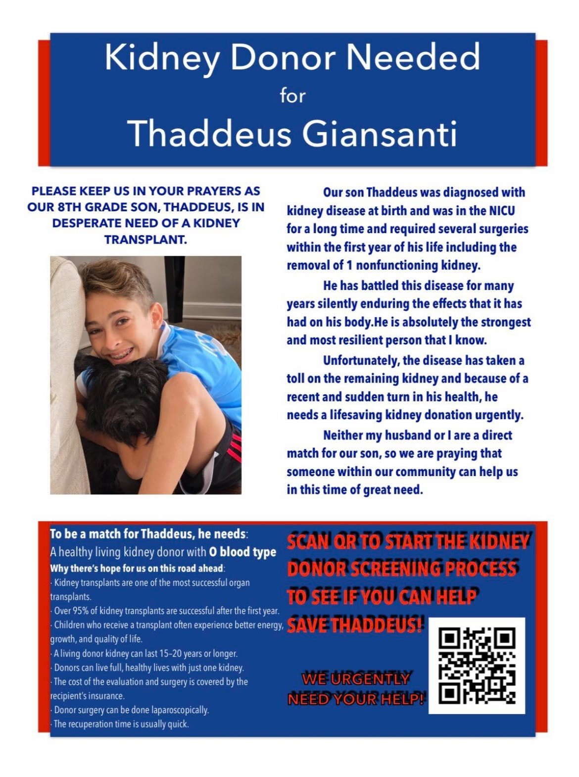 More details about Thaddeus' situation are provided below, along with a QR code that directs you to a website run by Children's Hospital of Philadelphia to check your potential compatibility.