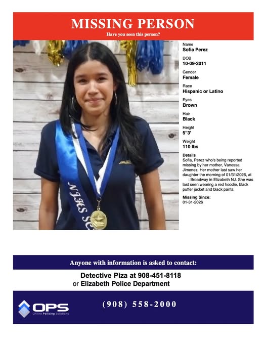Sofia Perez has been reported missing from Elizabeth, New Jersey. She was last seen on the morning of January 31, 2026. Sofia is a Hispanic or Latino female, 5'3" tall, 110 lbs, with black hair and brown eyes. She was last seen wearing a red hoodie, black puffer jacket, and black pants. Authorities are asking for the public’s help as they continue efforts to locate her.
