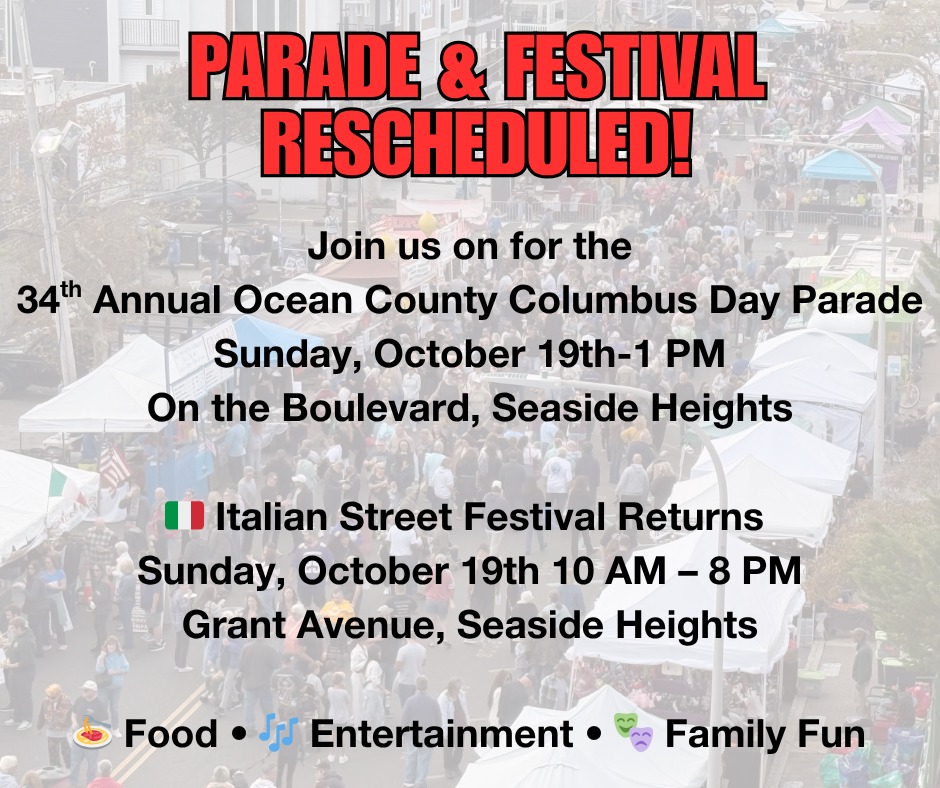 Good news! The 34th Annual Ocean County Columbus Day Parade has been rescheduled for Sunday, October 19th at 1 PM on the Boulevard in Seaside Heights!
