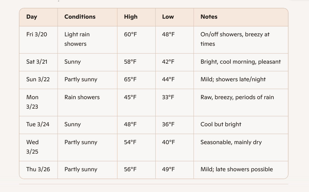 New Jersey’s Weekend Spring Weather: Sunshine, Showers, and a Classic March Mix New Jersey eases into spring this weekend with a little bit of everything—sun, clouds, and a few showers in the mix. After a damp stretch to end the workweek, drier and brighter conditions build in for much of Saturday, with milder air returning Sunday before another round of rain early next week. Temperatures will run close to typical late‑March levels, with cool mornings and comfortable afternoons.