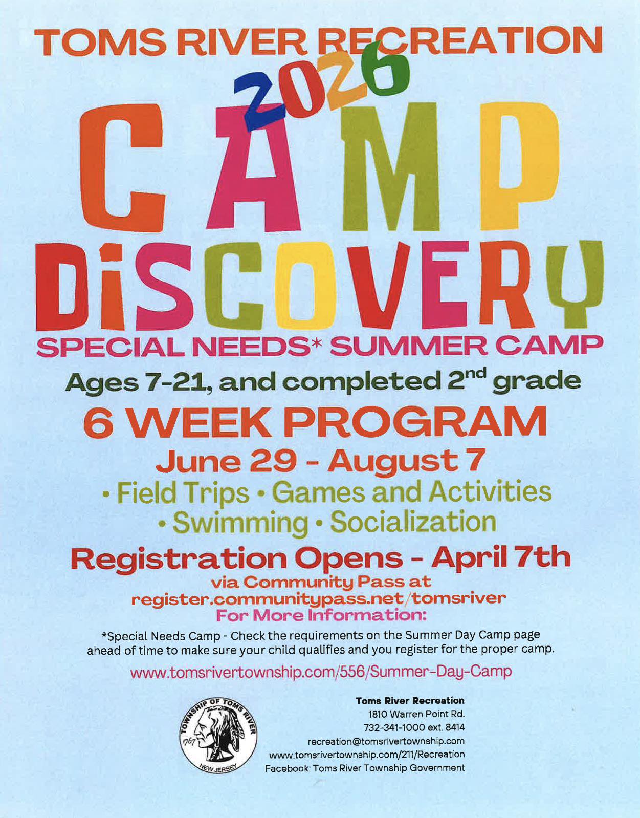 Registration for Camp Discovery, 6-Week Special Needs Summer Camp, is now open at the following link: Register.CommunityPass.net/TomsRiver