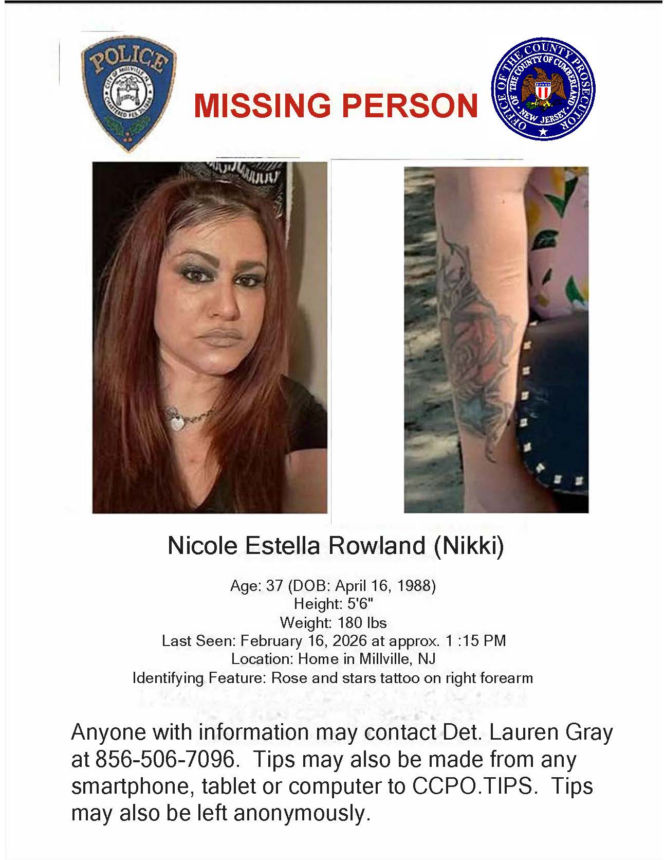 The Cumberland County Prosecutor’s Office Special Victim’s Unit is attempting to locate Nicole Estella Rowland who was last seen on February 16, 2026 at approximately 1:15 pm.