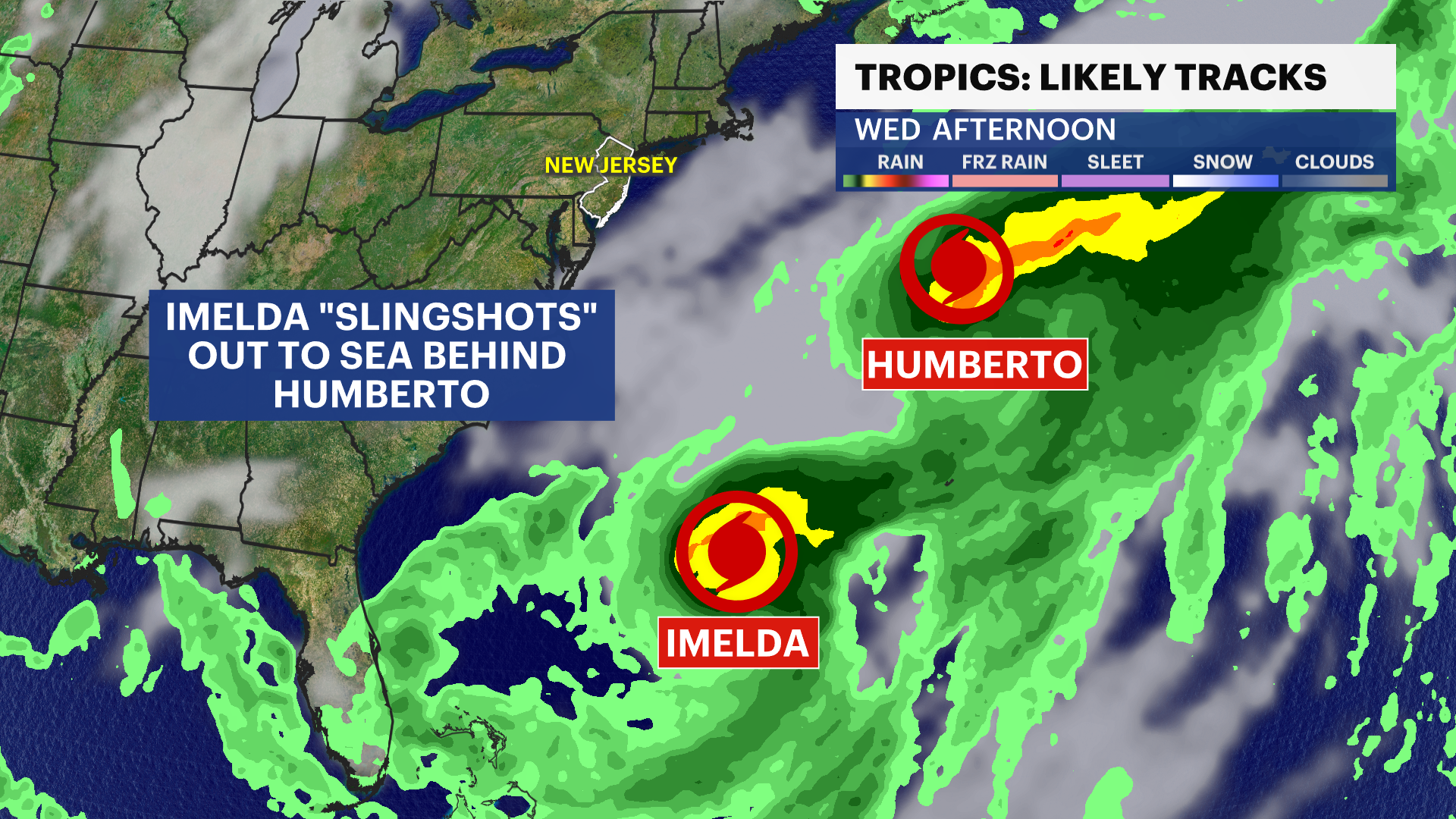 Off the coast of the Southeast, Tropical Storm Imelda and Hurricane Humberto will tango. The "Fuijiwhara Effect" is a meteorological phenomenon that occurs when Humberto and Imelda draw close to one another.